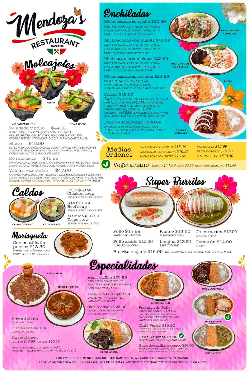 Don't miss the soul-soothing Caldos served on weekends, featuring comforting menudo and beef soup for $18.99 and $21.99 respectively. Customers rave about the tasty enchiladas rojas suizas and the flavor-packed Birria. Friendly service complements the generous portions, ensuring diners leave satisfied. Experience Mendoza’s, where every meal feels like a celebration.